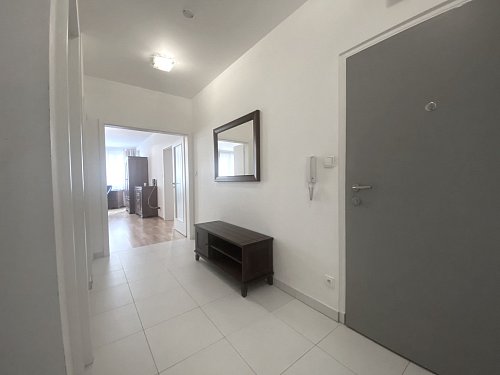 Vstup do bytu je zajištěn prostornou předsíní, která slouží jako centrální spojovací prostor mezi jednotlivými místnostmi. V předsíni se nachází koupelna s vanou, toaletou a podlahovým vytápěním, abyste si mohli užívat příjemné teplo po celý rok. Koupelna je vybavena pračkou značky Zanussi pro Vaše pohodlí. Vedle koupelny se nachází také samostatná toaleta, která je praktickým řešením pro rodiny i hosty. Prostor v předsíni dále nabízí i komoru o rozloze 2m2, která poskytuje dostatek prostoru pro uložení Vašich věcí.